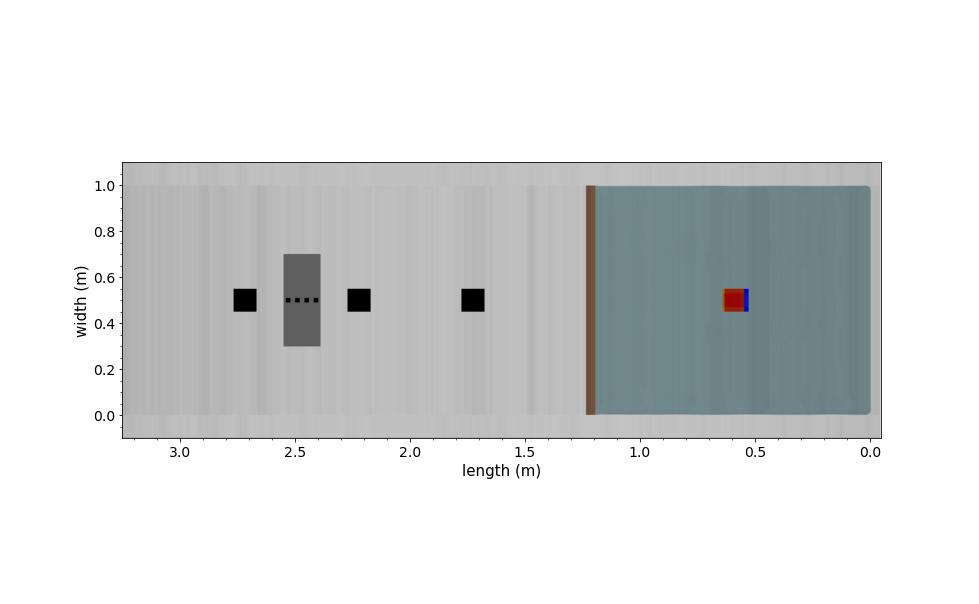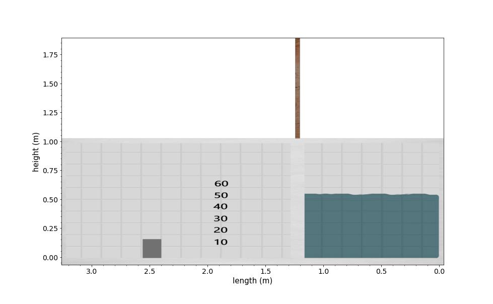 According to [1] , the shutter holding the volume of water in place is pulled up almost instantaneously before the water flows across the tank. The influence of varying shutter opening speeds is not investigated with this setup. Hence, the wooden shutter included in the setup in PreonLab (Figure 2) serves rendering purposes alone and has no influence on the simulation. It is assumed that the shutter is opened instantaneously, and that the volume of water breaks down into a flow due to gravity.