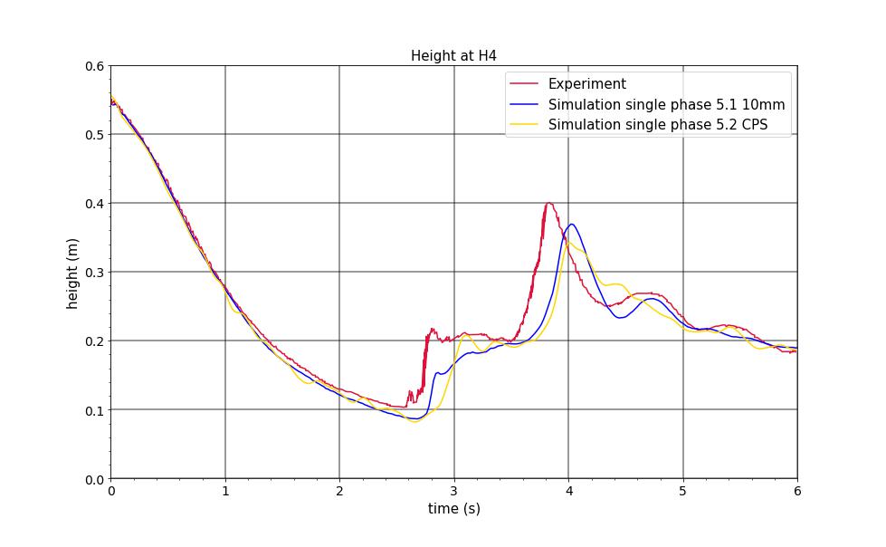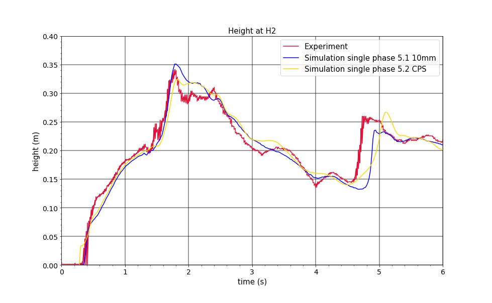 Figure 5a: Height in (m) after 6 s of simulation at location H2: Comparison between simulation results using a uniform resolution, simulation results using CPS and experimental data.