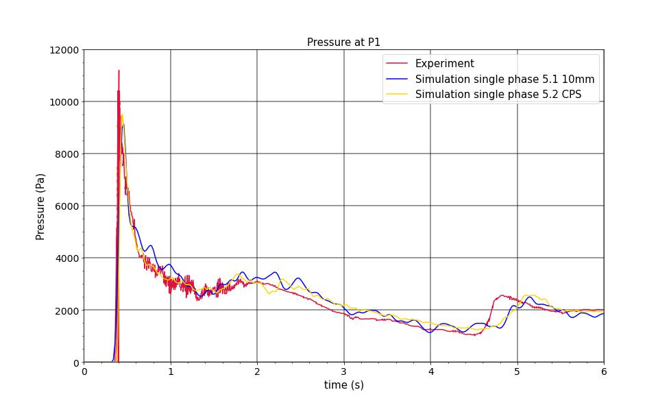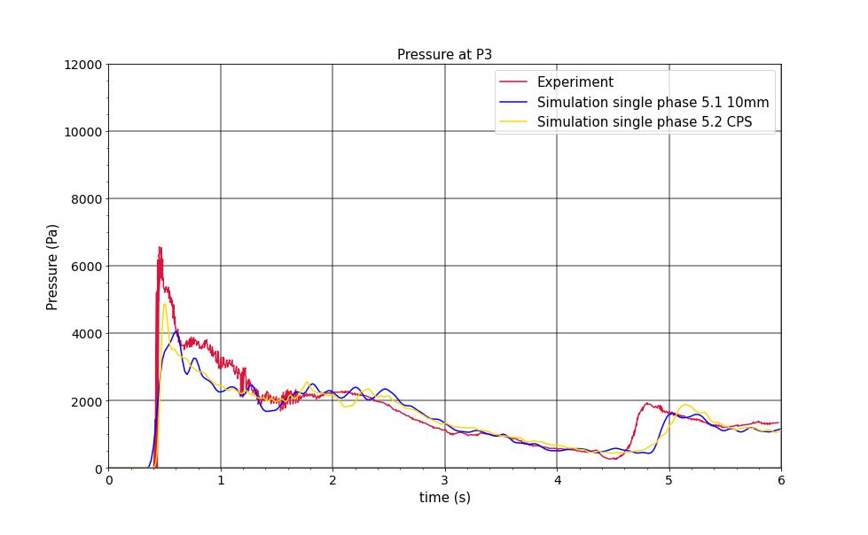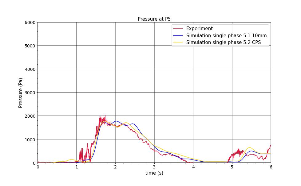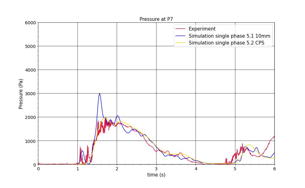 Note: The measured values for pressure at P1, P3, P5 and P7 published in [1] show an initial value of 1000 Pa acting on the obstacle – even at t = 0 s, where the flow has not reached the obstacle. Since no direct explanation for this pressure value could be found in the paper, this offset of