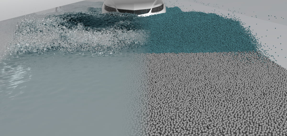 Conveniently, most of these scenarios involve large bodies of fluid that actually only require a high level of detail in certain regions. Consider a wading simulation: Do you really need an accuracy of 5mm 20 meters ahead of the car? With PreonLab 4.0, you can now set two levels of detail in the same simulation by using simulation boundary domains to specify which regions of the simulation require a high resolution. For the exemplary wading case that is depicted below (simulated for 20 physical seconds), this brings down computation time from 11.5 to 6 hours and reduces the size of the generated data from 133 to 57 GB.