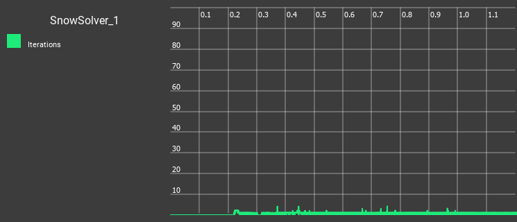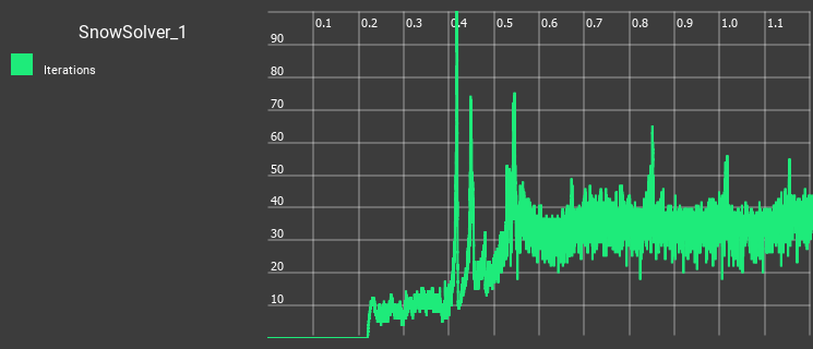 The higher accuracy in the right image results in chunkier snow on the ground while on the left the snow is very brittle, almost like sand. However, the higher accuracy has its costs. Here are the iteration statistics of the snow solver in the wedge scene:
