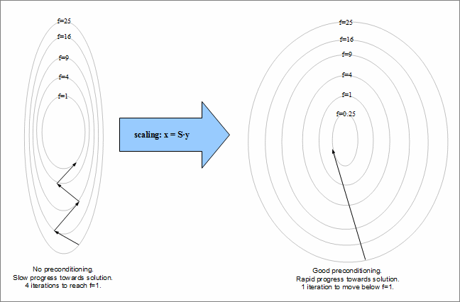 P needs to be easily invertible. Otherwise, we are solving two linear systems and gain nothing. A class of matrices that are easily invertible are diagonal matrices. The inverse of a diagonal matrix is diagonal as well. To find the inverse one just needs to apply the reciprocal to each diagonal entry. A common preconditioner is the Jacobi Preconditioner in which P is a diagonal matrix, and its diagonal entries are just the diagonal entries of A. The following picture (Source) illustrates how a preconditioning changes an optimization problem with S = AP-1 :