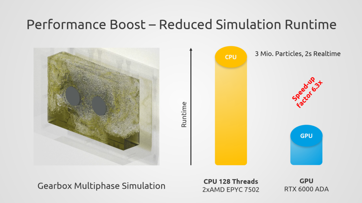 Figure 3 shows the speed-up which can be achieved on GPU for a multiphase gearbox simulation with 3 million particles when compared with CPU with 128 threads.