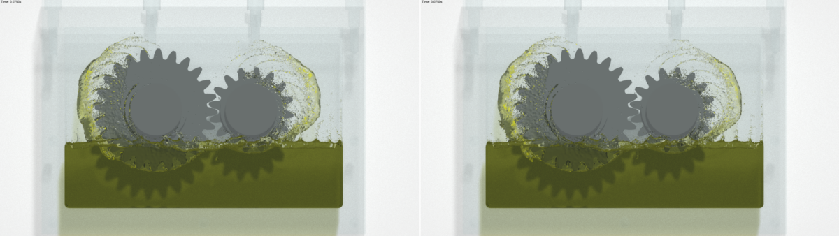 Figure 5: Visualization of multiphase FZG gearbox simulations performed on CPU (left) and GPU (right)
