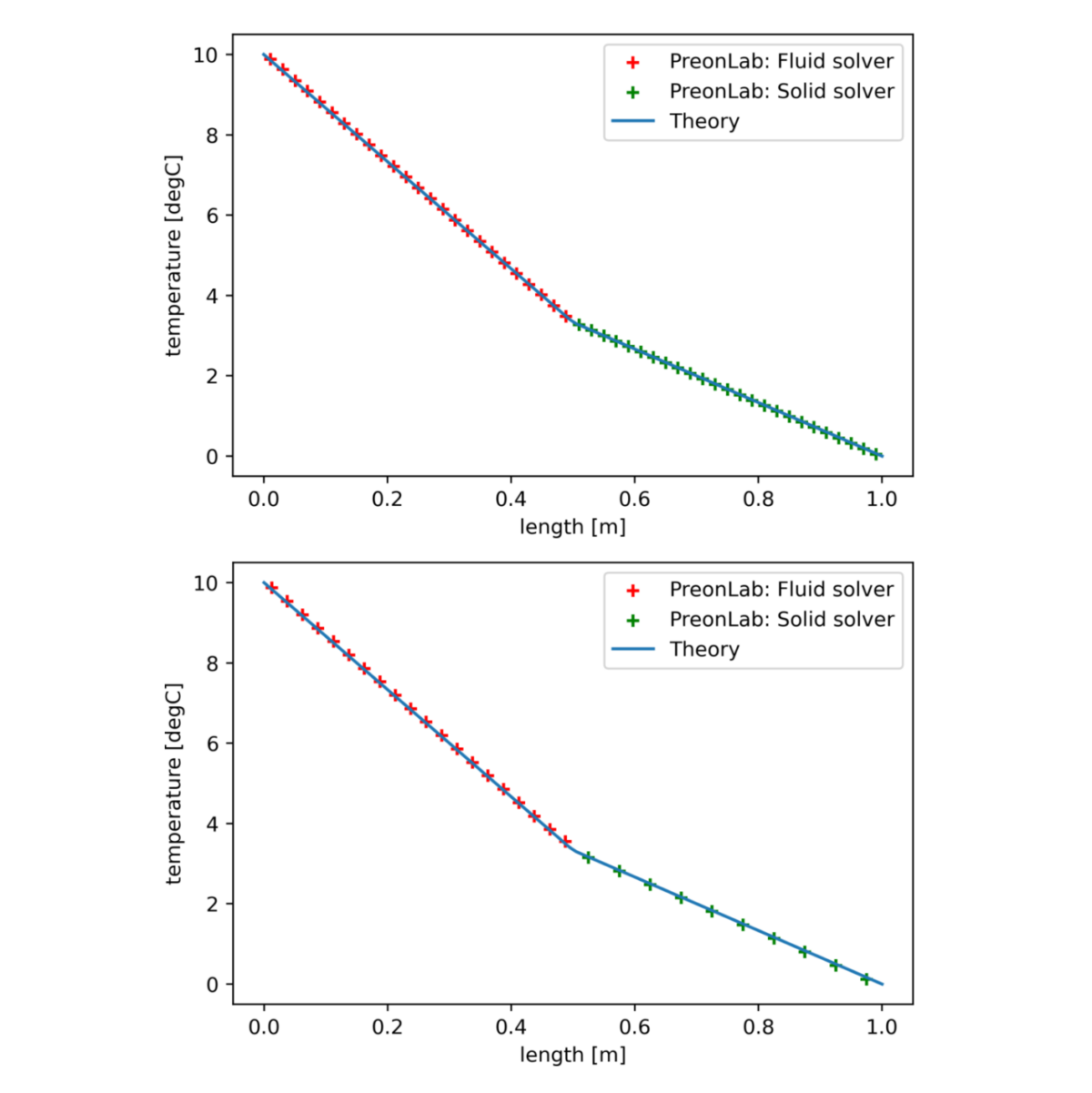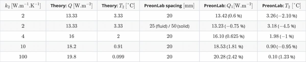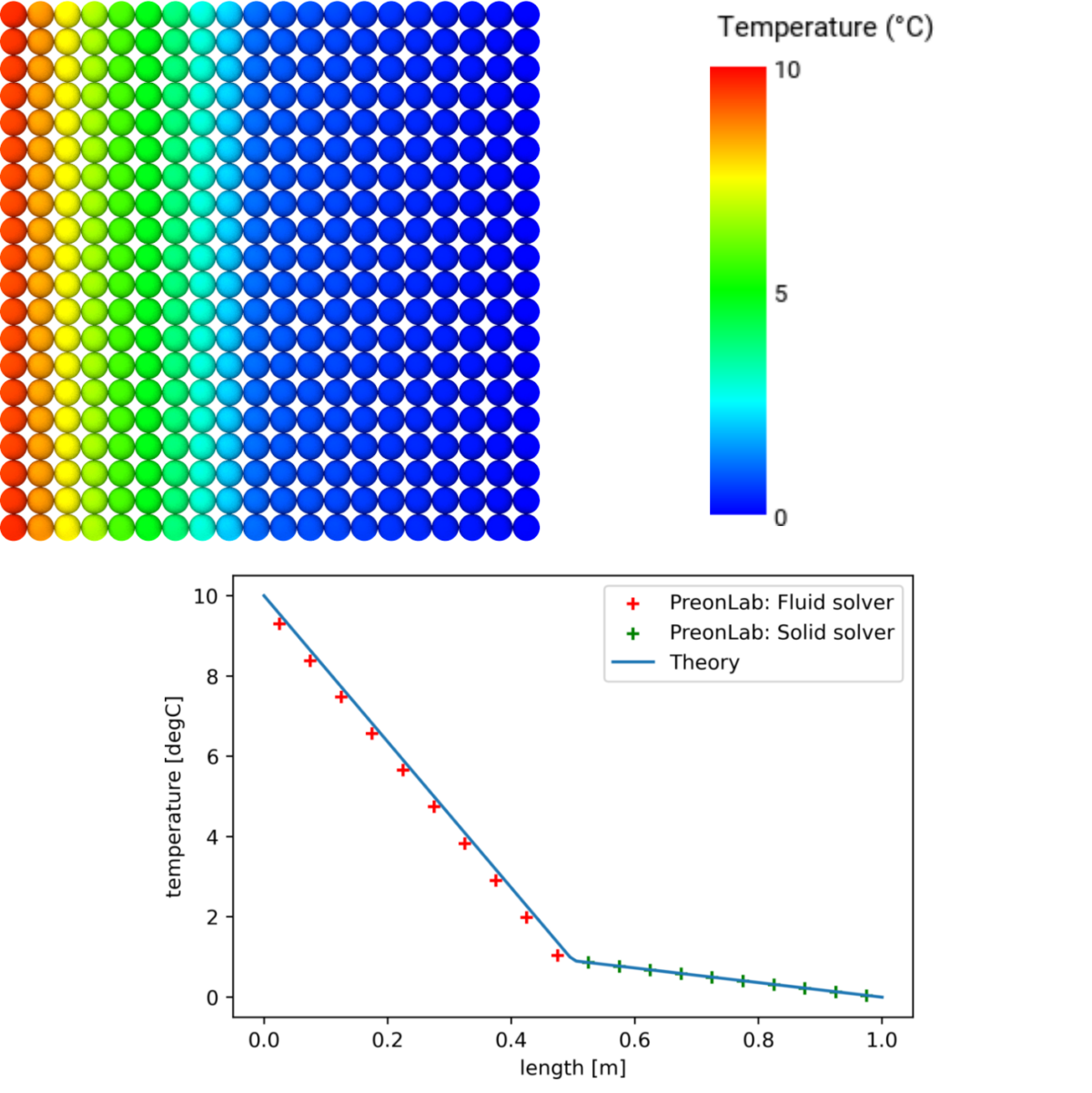 PreonLab simulations have been validated against analytical solutions for a variety of configurations for the composite wall benchmark. Most notably the CHT implementation is producing reliable results. Heterogenous spacings have also been tested and validated. Finally, the main thermal boundary conditions (temperature and heat flux) showed good results.