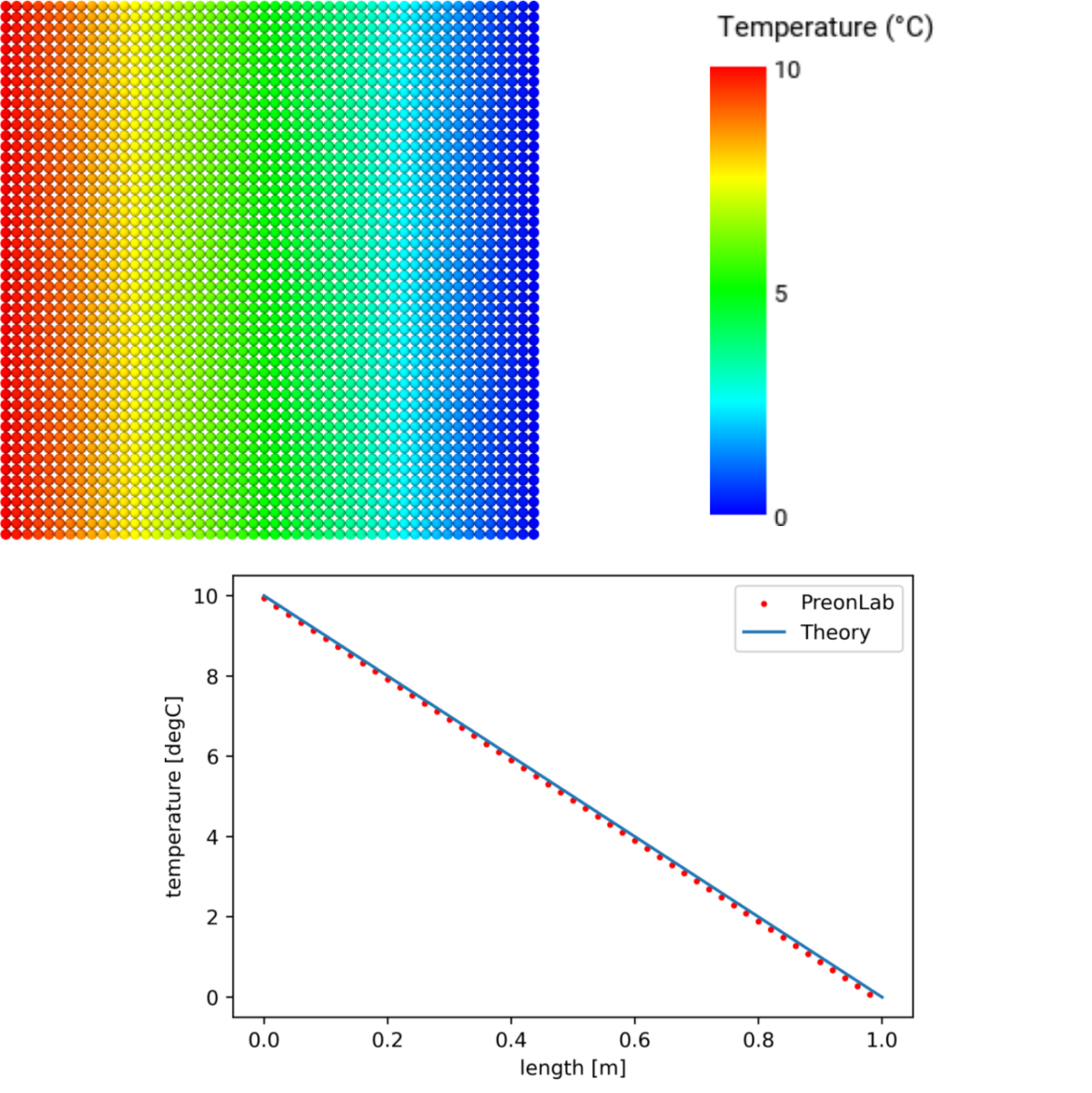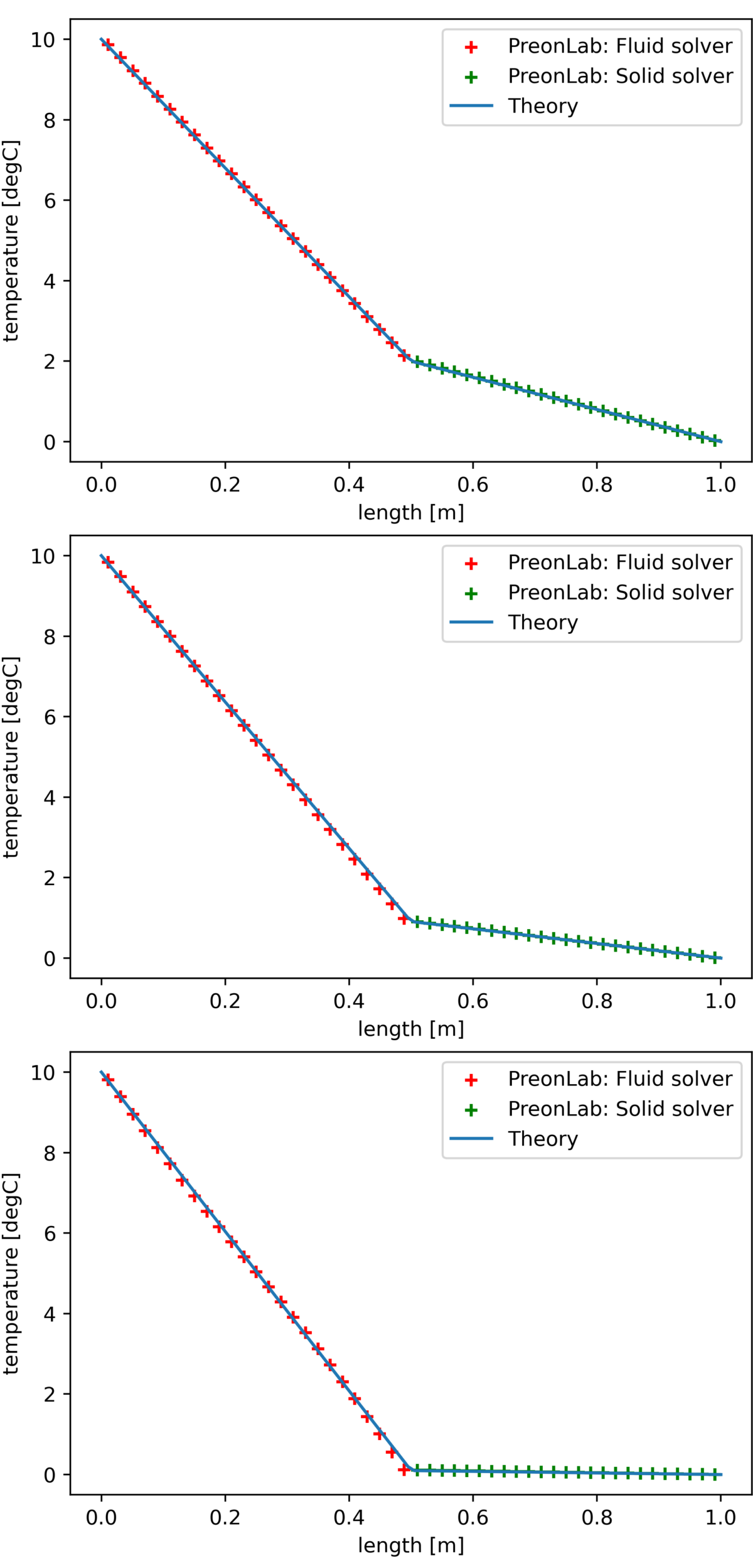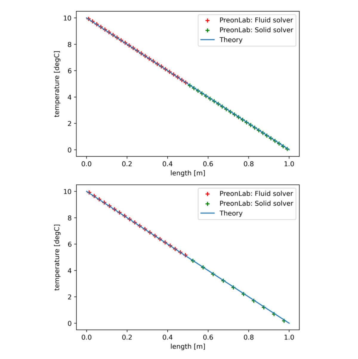 PreonLab simulations have been validated against analytical solutions for a variety of configurations for the composite wall benchmark. Most notably the CHT implementation is producing reliable results. Heterogenous spacings have also been tested and validated. Finally, the main thermal boundary conditions (temperature and heat flux) showed good results.