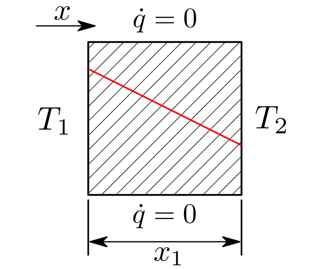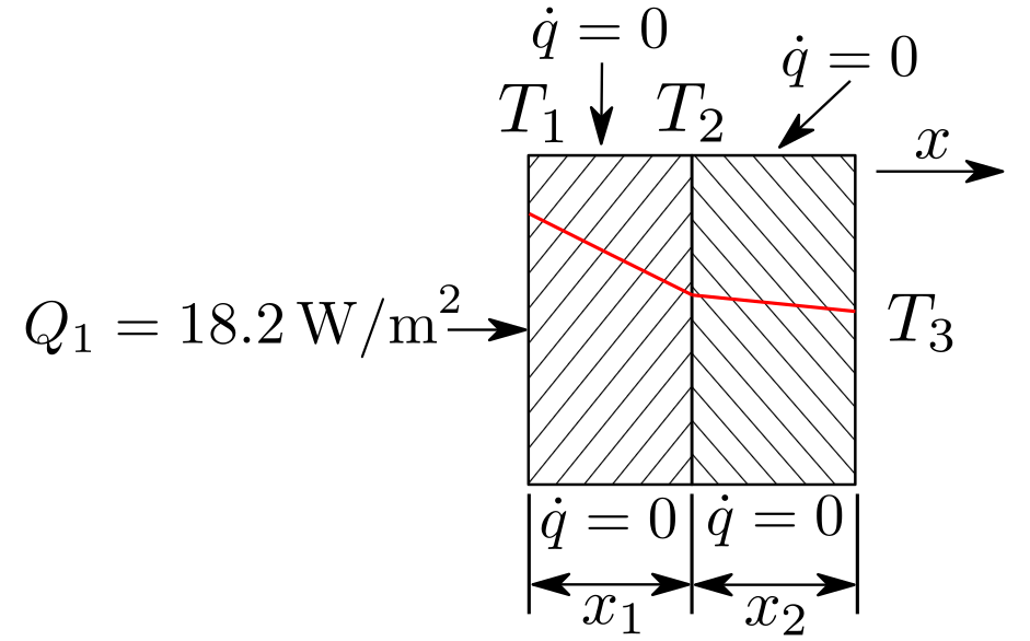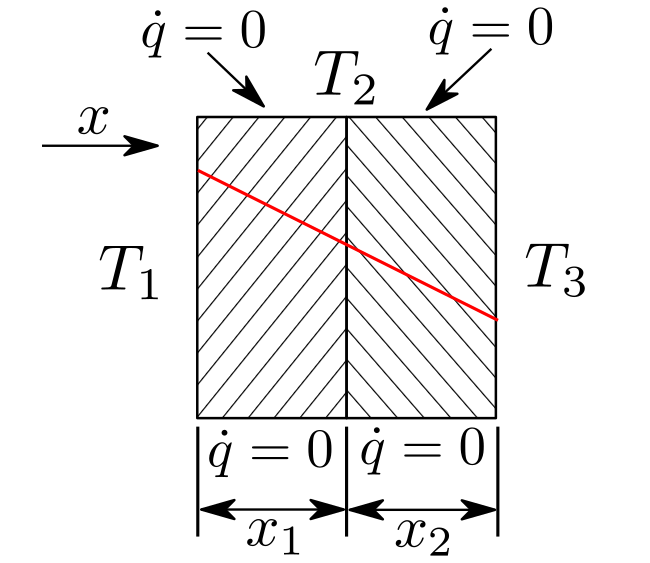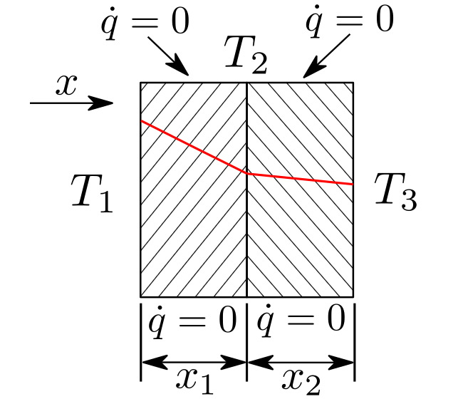 x_{1}\leq x\leq x_{2} & \Rightarrow T_{1}-\frac{Q}{A}\left(\frac{x_{1}}{k_{1}}+\frac{\left(x-x_1\right)}{k_{2}}\right)