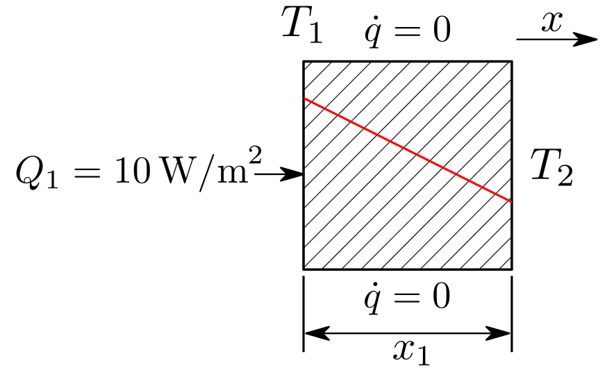 Using equation 1, the heat flux can be estimated for this configuration with: $$ Q = -\frac{k_1 A}{x_1} \left(T_2 – T_1 \right)\hspace{1.5cm}(3) $$