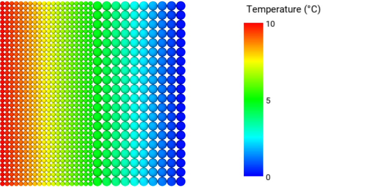 The theoretical temperature on the left side \(T_1\) is \(10\) °C. In PreonLab for a spacing of \(20\) mm, the measured temperature on the left side is \(9.91\) °C (\(-0.9\) %). Equation 4 can be used again to estimate the theoretical temperature distribution within the wall. The rendered result and the temperature distribution are shown in Figure 13.