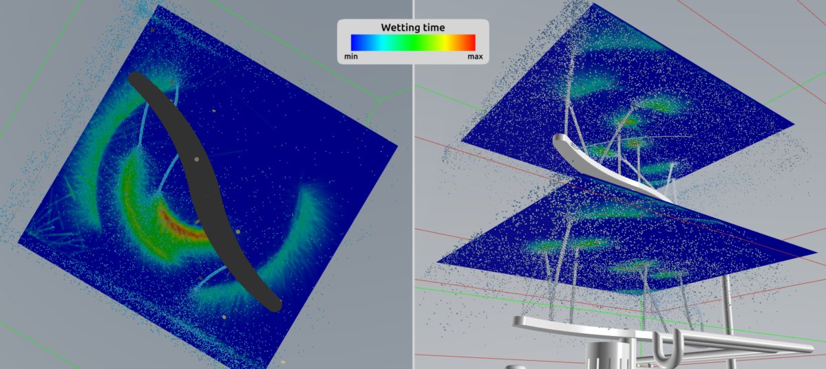 Vid. 4: Simulation of the interaction between the spray arm (rigid body) and water (fluid) using PreonLab’s Rigid Body Solver.