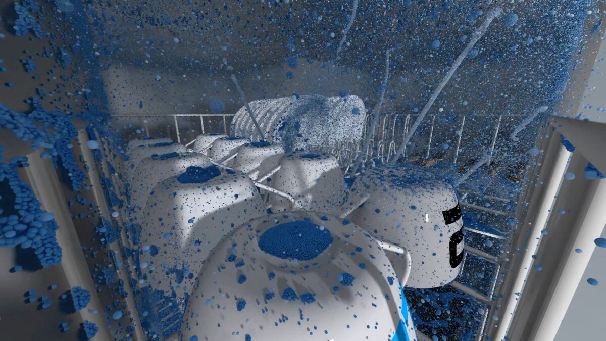 Vid. 3: Simulation of a dishwasher including the physical dirt removal.
