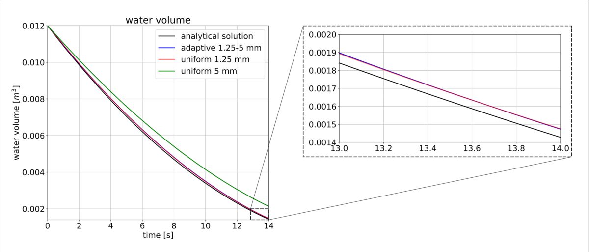 Figure 1 shows the high-resolution uniform simulation and the adaptive simulation side by side for a visual comparison. Figure 2 shows how the volume inside the box changes over time. The adaptive simulation produces almost the same result as the simulation with a uniform particle diameter of 1.25 mm. Both are much closer to the analytical solution than to the coarse simulation with 5 mm particle diameter.