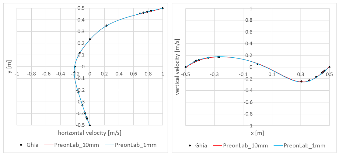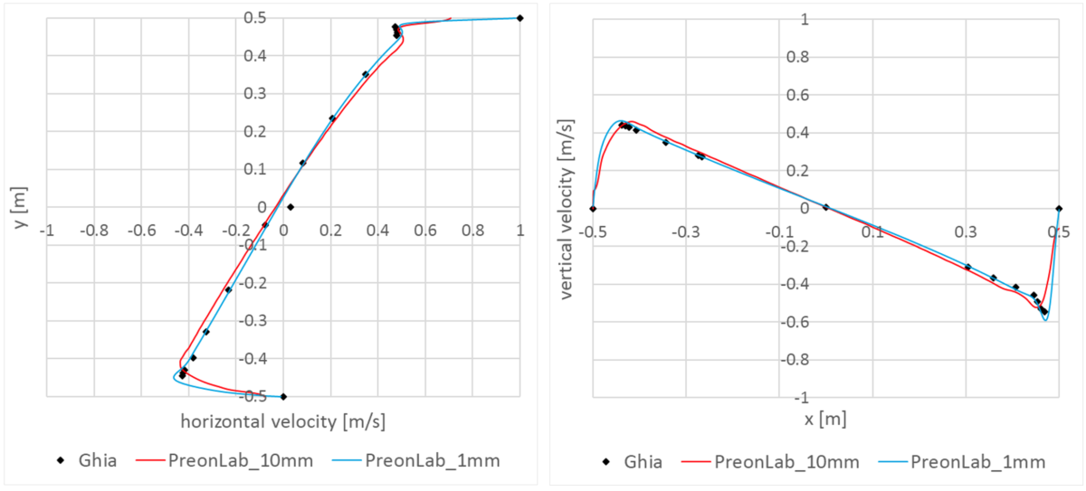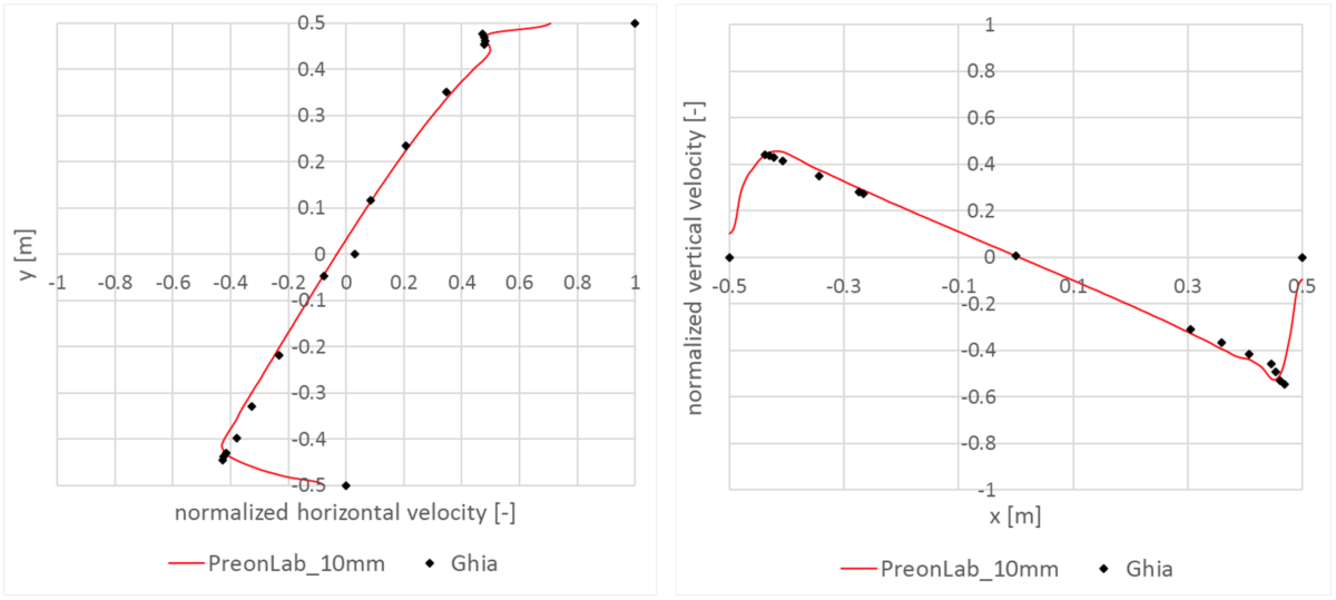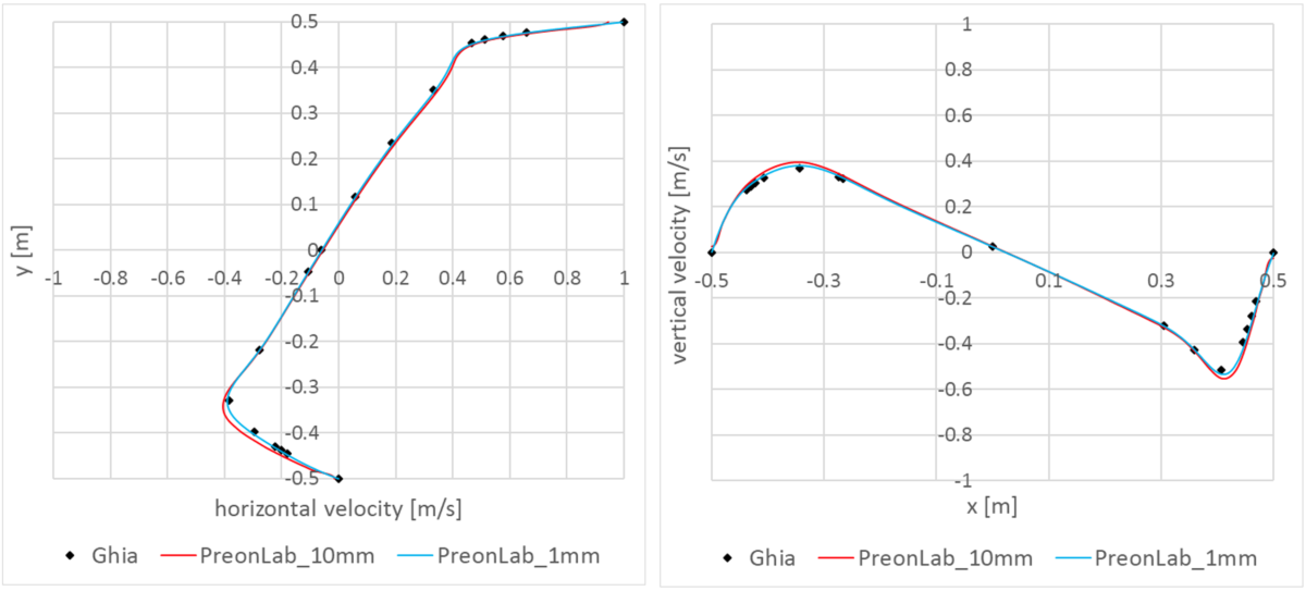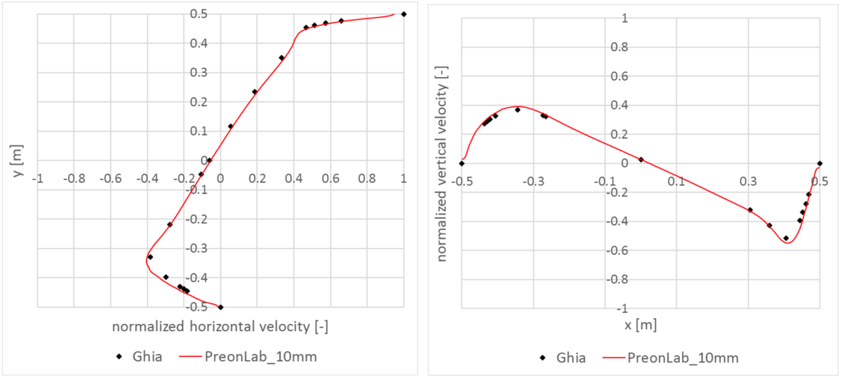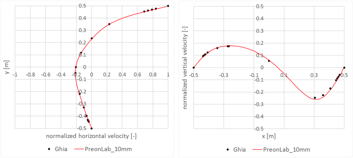 The quest for efficiency and accuracy began with the work of Ghia et al. [1] in 1982. Their study covered steady-state two-dimensional flow for Reynolds numbers up to 10,000 in a square lid-driven cavity with its moving wall having constant velocity. This article is still the most widely used reference for this regard. Therefore, in the current article, PreonLab is validated for Reynolds number equal to 100 and 1,000 as well as 10,000 against the results from this article.