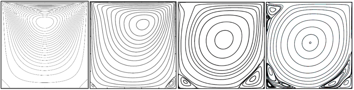 Typical streamline patterns of the two-dimensional lid-driven cavity for Reynolds numbers 1, 100, 1,000 as well as 10,000 are shown in Fig. 14. For Re = 1, the streamlines are nearly symmetrical, due to the symmetry of velocity field in the Stokes-flow limit where Re → 0. Two separated eddies in the bottom corners are characterized by the two separating streamlines. When the Reynolds number becomes large (Re = 10,000), inertia terms in the Navier-Stokes Equation become dominant and destroy the reflectional symmetry of the velocity field with respect to x = 0. The separated vortices at the bottom become stronger, and even a second separated vortex is generated in the bottom right corner of the cavity. Moreover, a third separated region is created, for Reynolds numbers greater than 1,000, close to the upstream corner of the moving lid near (Look at the case with Re = 10,000). For even higher Reynolds numbers, the core of the vortex approaches a solid-body rotation with circular streamlines and constant vorticity [5].