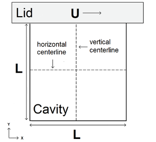 The problem consists of a fluid with density ρ and viscosity µ inside a square cavity. The cavity is made up of three rigid walls with no-slip conditions and length L as well as a no-slip lid which moves with a tangential velocity of U, see Fig. 1.