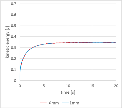 Fig. 2: Total kinetic energy of the fluid for Re = 100 with 10mm and 1mm fluid spacing.
