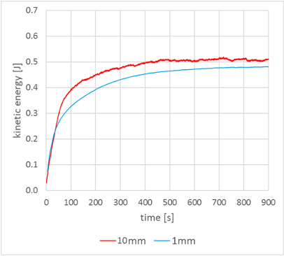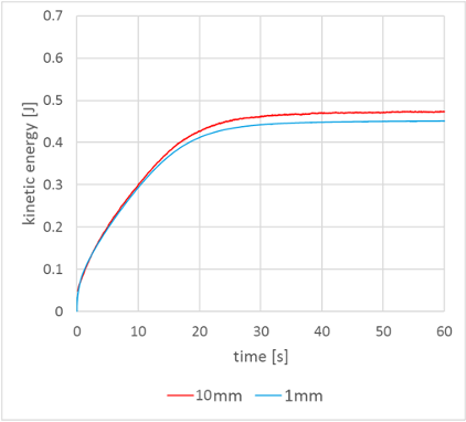 Fig. 5: Total kinetic energy of the fluid for Re = 1,000 with 10mm and 1mm fluid spacing.