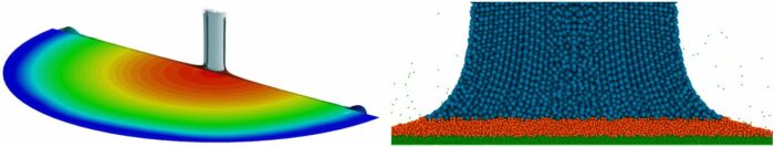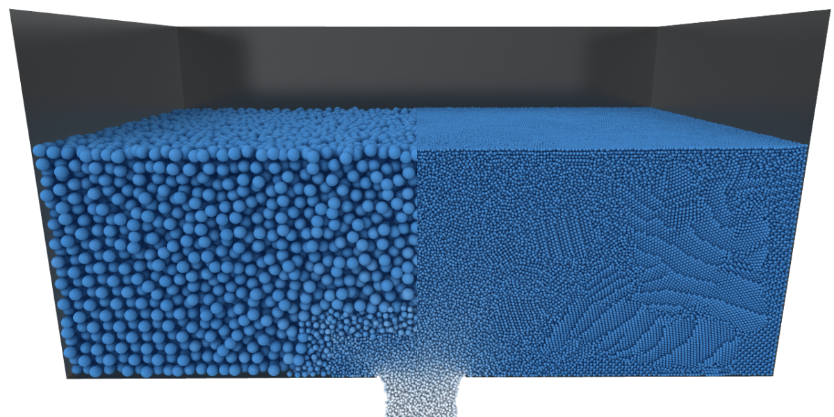 Comparison between adaptive resolution (left) and uniform resolution (right). In this setup, fine particles are only required near the outflow to achieve good results. This reduces computation times by an order of magnitude.