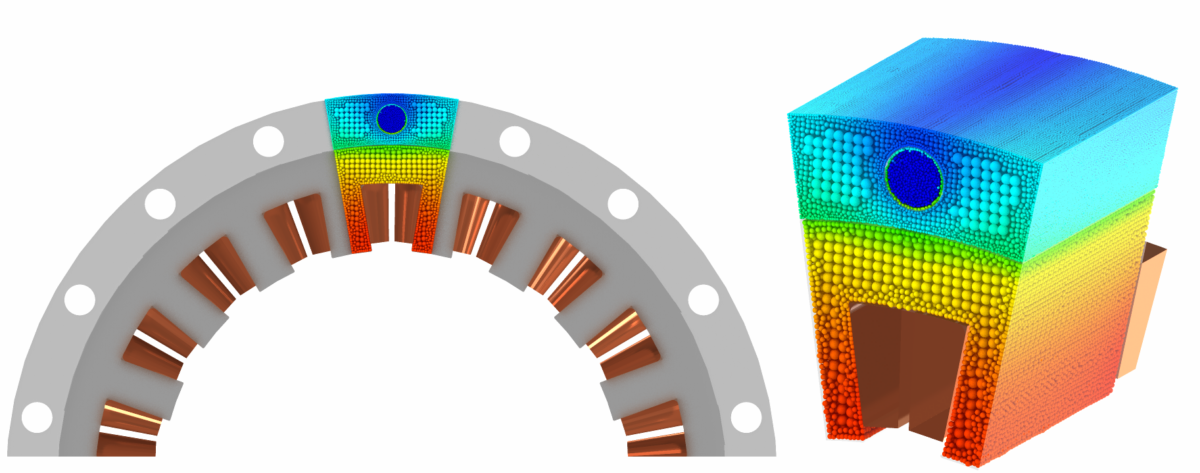 In this e-motor cooling example, the conjugate heat transfer is computed between fluid and engine parts. The heat transfer within the latter is performed using the Solid Volume Solver which supports adaptive resolution with 5.1. An initial guess of the temperature distribution within the solid parts was derived from an imported point cloud for faster convergence.