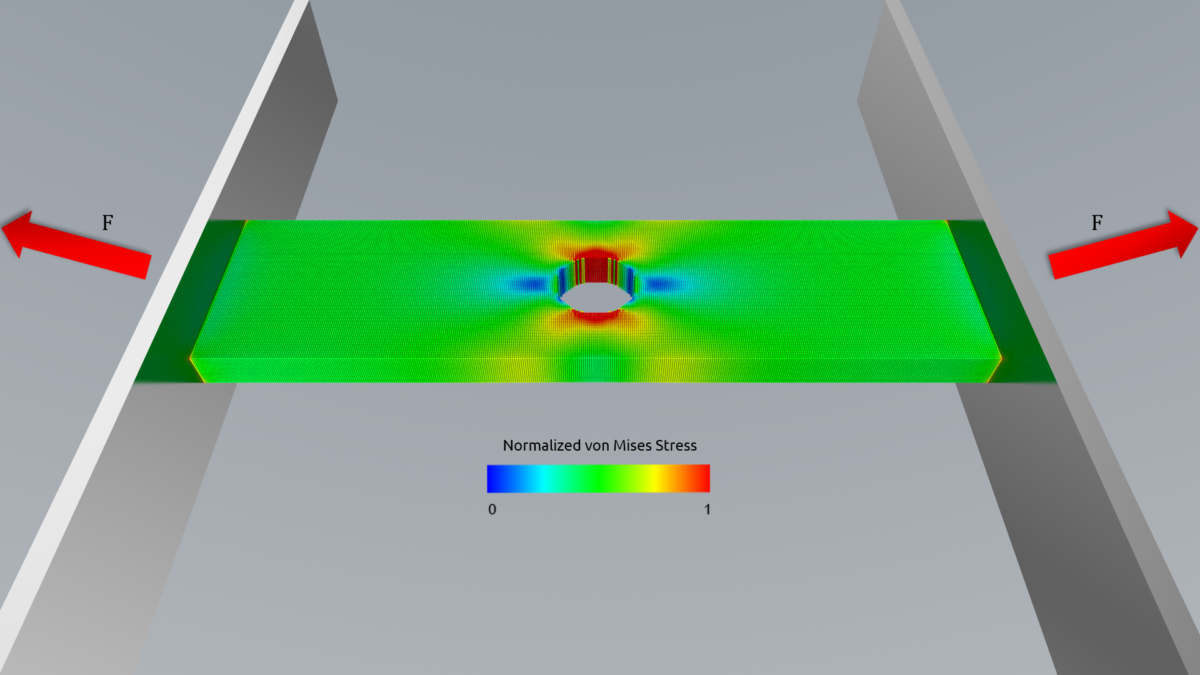 Von Mises stress distribution over a strip with a hole in the middle that has been stretched from both ends.