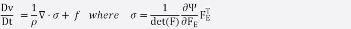 The Cauchy momentum equation describes how the Snow Solver moves forward in time. The Cauchy Stress tensor σ creates the elasto-plastic forces of the snow and ƒ are other body forces, e.g., gravity or wind. We assume hyperelasticity, thus the stress tensor comes from an elasto-plastic energy density function whose inputs are the elastic FE and plastic FP deformation gradients. Multiplicative plasticity theory divides up deformation into elastic recoverable and plastic permanent parts F=FEFP.