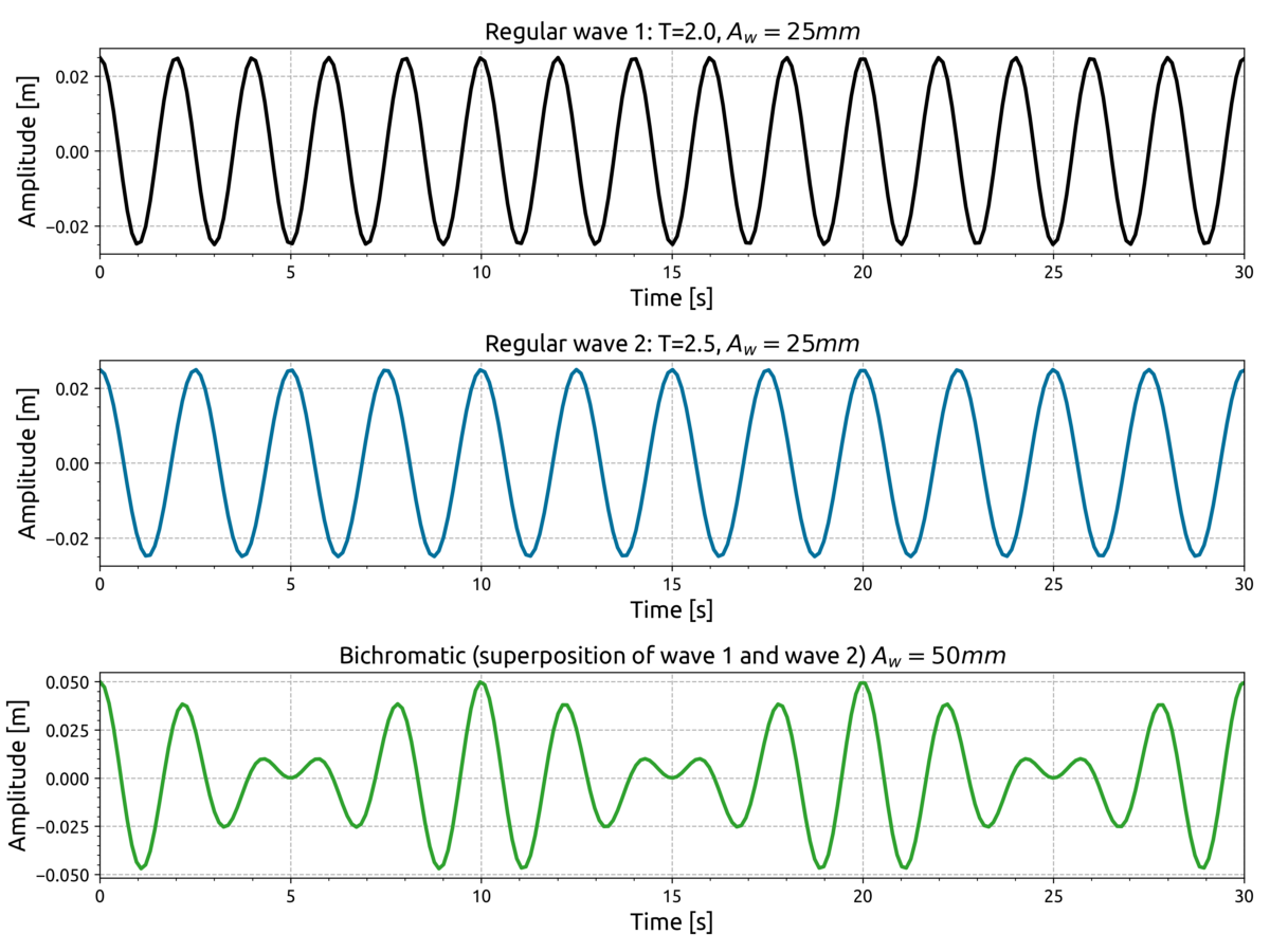 Using the above linear wave theory and BTFs, arbitrary irregular waves can be composed through the superposition of multiple waves with varying amplitudes and frequencies. Simple examples are biochromatic waves which consist of two waves with different frequencies as shown in Figure 3.