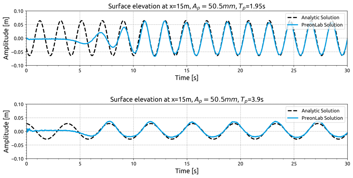 Figure 5: Wave elevation as a function of time at a distance of 15 meters from the wave maker. (Top) shows the wave elevation for wave actuation with A = 50.5 mm and T = 1.95s, and (bottom) for wave actuation with A = 50.5 mm and T = 3.9 s. The black curve represents the analytic solution whereas the blue curve represents the numerical solution obtained using PreonLab.