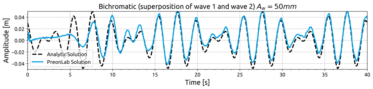 By generating an actuation signal for each wave component and subsequently adding them together, the actuation signal for the bichromatic wave is obtained. This signal can directly be used in PreonLab to keyframe the horizontal position of the wavemaker in time.