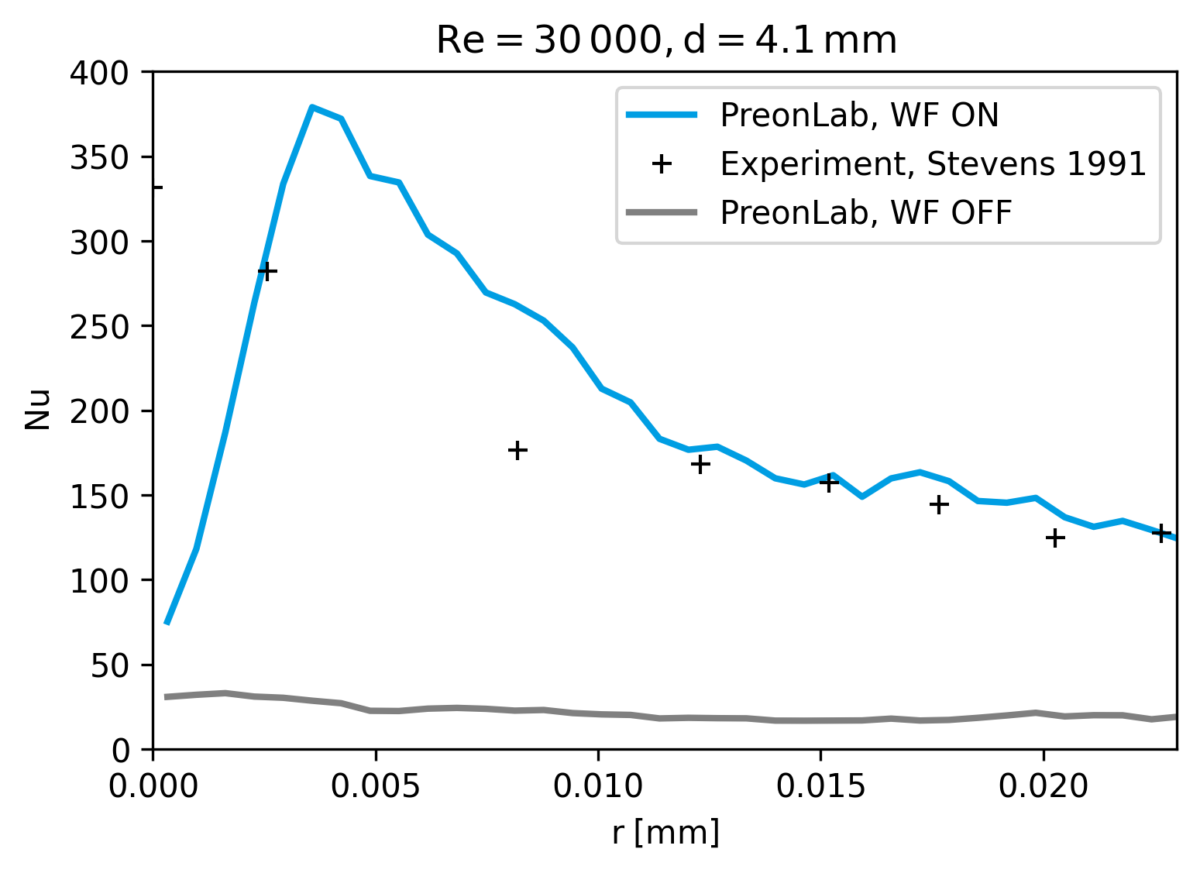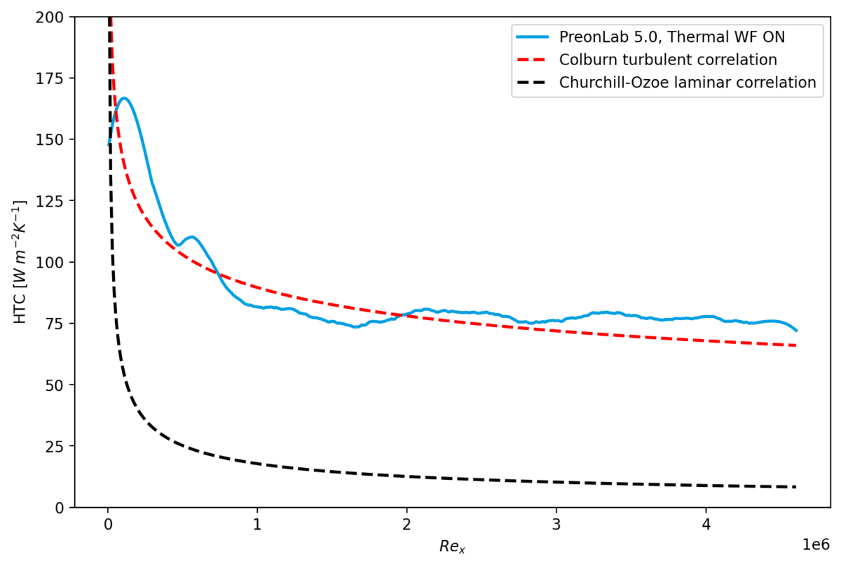 One of the first benchmarks we ran for this new feature was the well-known case of a turbulent flow over a heated flat plate with zero pressure gradient. This is a key benchmark for wall functions as the two main benchmarked quantities, the skin friction coefficient and the heat transfer coefficient, reflect the ability of the wall function to reproduce the correct gradients at the wall. Here the particle spacing is controlled such that the dimensionless wall distance y+ lies within the validity range of the logarithmic wall law.