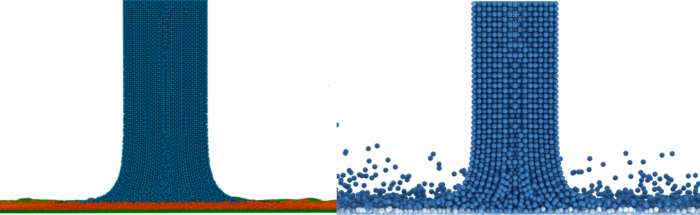 The above figure shows a simple setup where a water jet is impinging downwards on a heated flat disk. On the left, a refinement strategy was used for the near-wall region to resolve the near-wall gradients. On the right is a simulation with a relatively coarse resolution. Here the particles are coloured on a spectrum of blue to white according to their y+ values, with deep blue particles not being affected by the wall function model. The only differences between the two simulations are their particle spacings (and by extension, the strategy with which the near-wall area is handled).