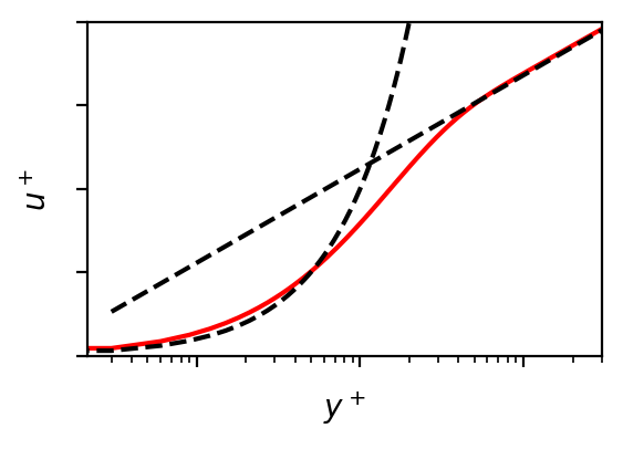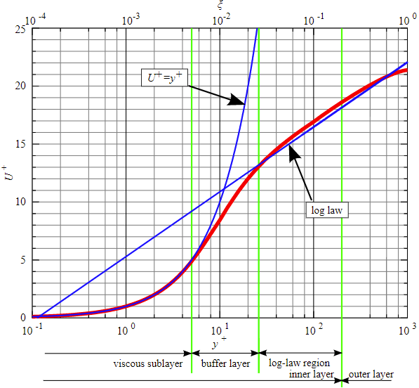 Plot of dimensionless velocity u+ against dimensionless wall distance y+. Source: Wikipedia