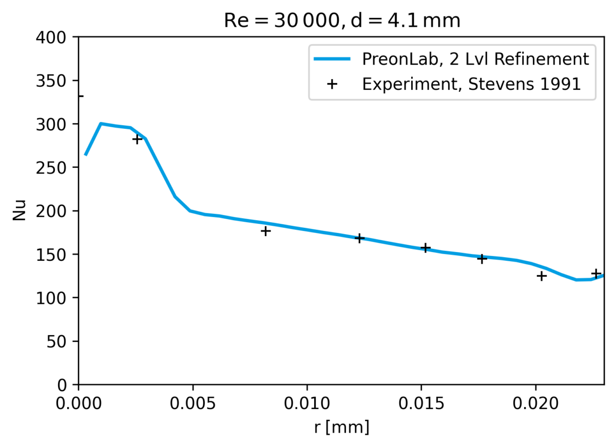 The above figure shows the Nusselt number, which is a dimensionless heat transfer coefficient, plotted against the radial distance from the center of the disk. When we compare the results of the coarse simulation and the simulation with refinement, we can see that the simulation with refinement clearly delivers more accurate results especially at the center of the disk. However, further away from the center, the results for the coarse simulation with wall functions activated are quite acceptable compared to the simulation with refinement. We can also see that what was once an unacceptably coarse simulation in the form of the gray line now delivers plausible results when wall functions are used in the simulation.