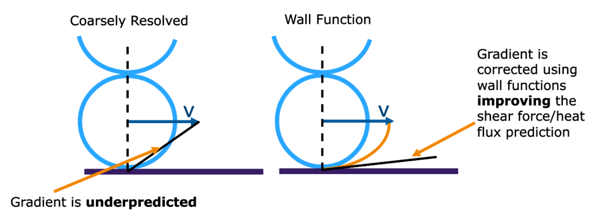 As can be seen from the picture above, using a coarse resolution does not resolve the gradient of the velocity profile at the wall properly – the resulting slope at the wall is much less steep than that of the actual profile. We can naturally improve this by resolving the gradient directly, i.e. simulating with a fine resolution to capture the large difference in flow variables near the wall.