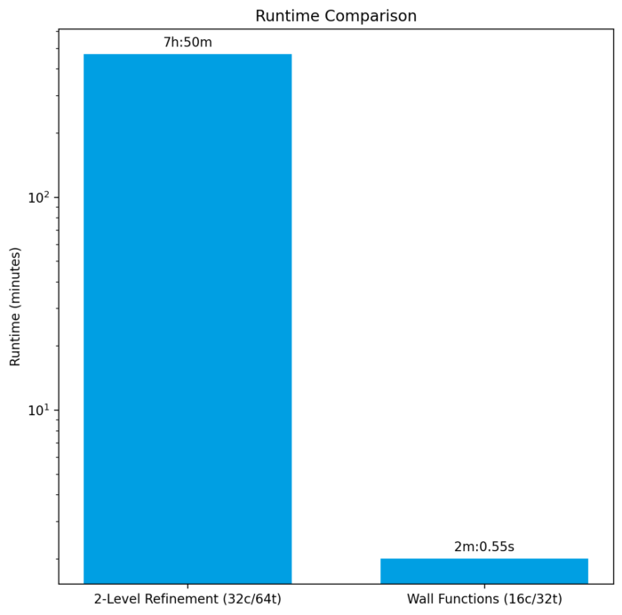 The runtime for the impinging jet case also shows something remarkable: Due to the much lower number of particles, the runtime for the coarse simulation is minimal compared to the finer simulation which resolves the gradients at the wall correctly. The other advantages of having a lower particle count apply here too, allowing for faster data transfer and much smaller storage requirements. For applications where large numbers of design iterations are needed, having wall functions makes a difference by allowing coarser resolutions to be run with an acceptable level of accuracy, allowing your first estimates to be generated much faster.