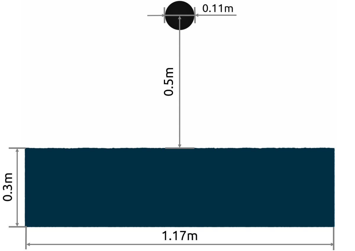 Before considering more advanced cases, we will validate the Preon Solver by means of an established benchmark test which involves a cylinder that is dropped into a reservoir filled with water. Greenhow and Lin [1] provide experimental data that is used as a reference in many publications (e.g., [2-4]). As shown in Figure 1, the described experiment consists of a cylinder with a diameter of 11 cm which is positioned 50 cm above the water surface inside a tank. It is then dropped into the water to examine the total displacement of the cylinder over time and the free surface effects during the water entry. The cylinder is a half-buoyant body, i.e., its density is 50% of the water density. Hence, it will decelerate and eventually return to the water surface.