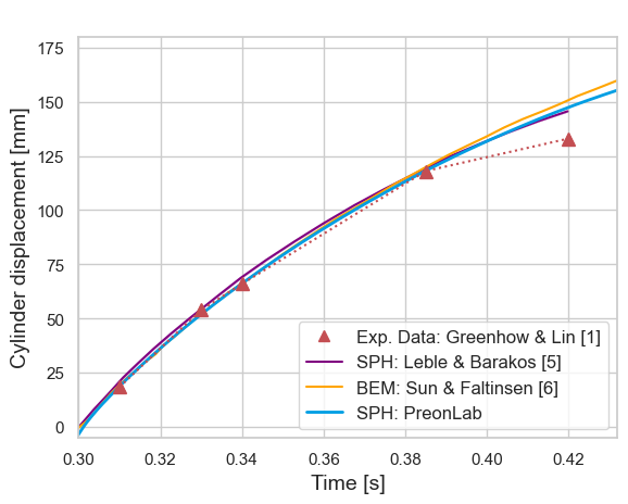 By reducing the simulation to 2D, we can compare the data among different solvers, as well as the experimental results within a matter of only a few minutes. In Figure 2, PreonLab is compared against experimental data [1] as well as another SPH solver [5] and a Boundary Element Method (BEM) approach [6]. The graph shows the vertical position of the cylinder after penetrating the water surface.