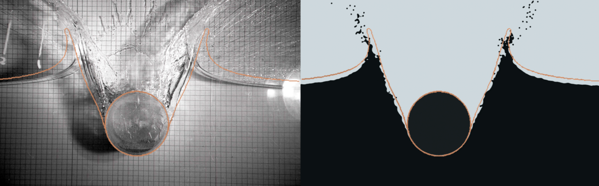 By conducting a resolution study with particle sizes ranging from 15 to 2 mm, the convergence towards the experimental data with decreasing particle size was confirmed. Another metric to evaluate is the splashing phenomena that occur during the entry phase of the cylinder. In Figure 3, images of the experimental results are shown on the left and results with PreonLab are visualized on the right. Both images are overlaid by the prediction of the free surface according to the BEM used in [6] as an orange line. The PotentialForce cohesion model enables PreonLab to capture splashing phenomena better than the BEM approach, even for a 2D model. PreonLab and the experimental data show a close correlation regarding the position of the free surface, while the entry depth of the cylinder is similar across all three approaches.
