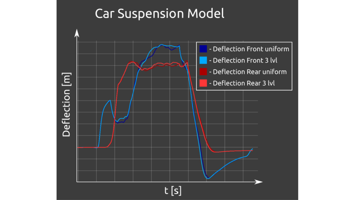 A comparison of the front (blue) and rear (red) spring deflections between the cases with uniformly sized fluid particles and with refinement (3 particle sizes).