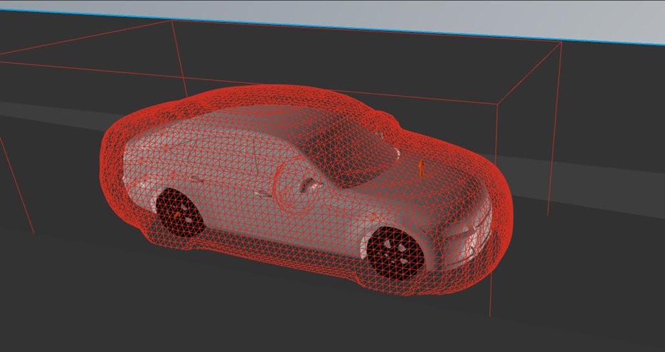 PreonLab offers CPS, which is an advanced adaptive refinement feature, which allows the use of arbitrary particle sizes within a given particle size range using a single solver. It is used to drastically reduce the computational time required when compared to a simulation with uniform resolution. The refinement domain can be defined as a box around the car. It can also be beneficial to define the refinement domain as a volume, based on its proximity to the car geometry. Image 4a shows the wireframe of a refinement domain around the surface of the car geometry. Image 4b shows the effect it has on adaptive refinement during simulation.