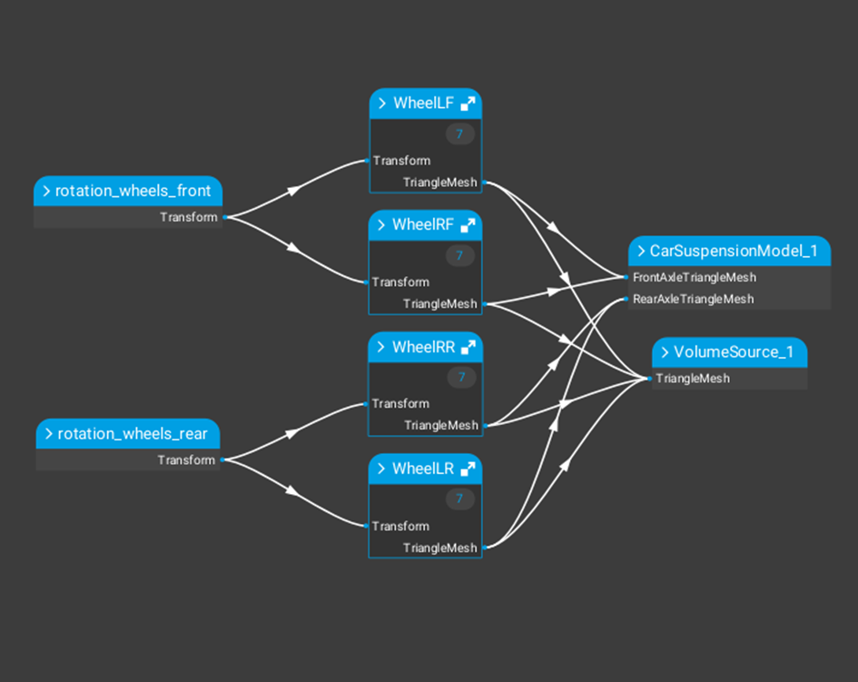 While working with a larger number of solid sub-meshes, the separate geometries need to be connected to one of the four main transform groups (transform group for sprung parts, transform group for non-sprung parts i.e., parts connected directly to the transform script, and the two transform groups for the rotation of the wheels). For example, the car model which you will import might have multiple objects per wheel like the hub, rim, tire and disc brakes. If this is the case, you can group these parts using solid object grouping and connect the most rotationally symmetrical part to the respective input of the Car Suspension Model. All the other rotating parts can be connected to the rotation transform groups depending on which is the relevant one, as can be seen in image 5.