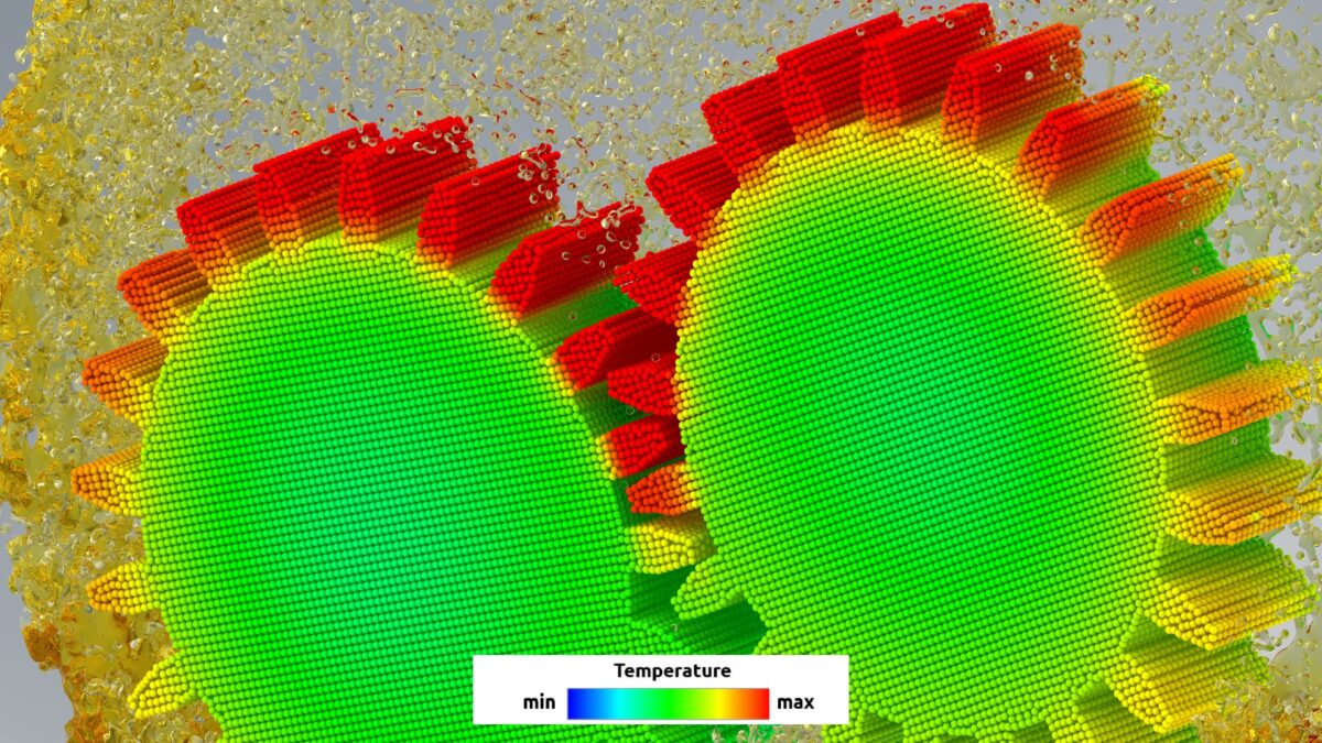 By default, solid objects in PreonLab are sampled only on their surfaces. However, by adding a Solid Volume Solver and a Solid Volume Source, sampling can be extended to the entire volume of the solid. This enables the simulation of heat dissipation within the solid. You can define thermal properties such as specific heat capacity and thermal conductivity for the gear material. Heat generation within the gears can be simulated using the heat field, which is a volumetric heat source in PreonLab, and the resulting heat exchange between the gears and the cooling lubricant can be analyzed using the thermal solver.