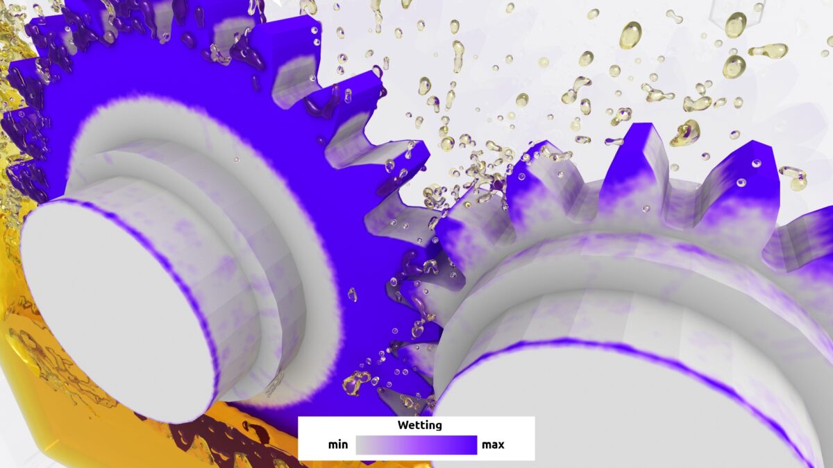 The lubrication distribution can be analyzed using the wetting sensor, which measures and visualizes both the current and total amount of wetting on any connected solid object. Additionally, the sensor tracks and displays the duration of contact between the object and the lubricant. This enables you to identify which parts of the gears interact with the oil and detect any regions that may not receive sufficient lubrication.